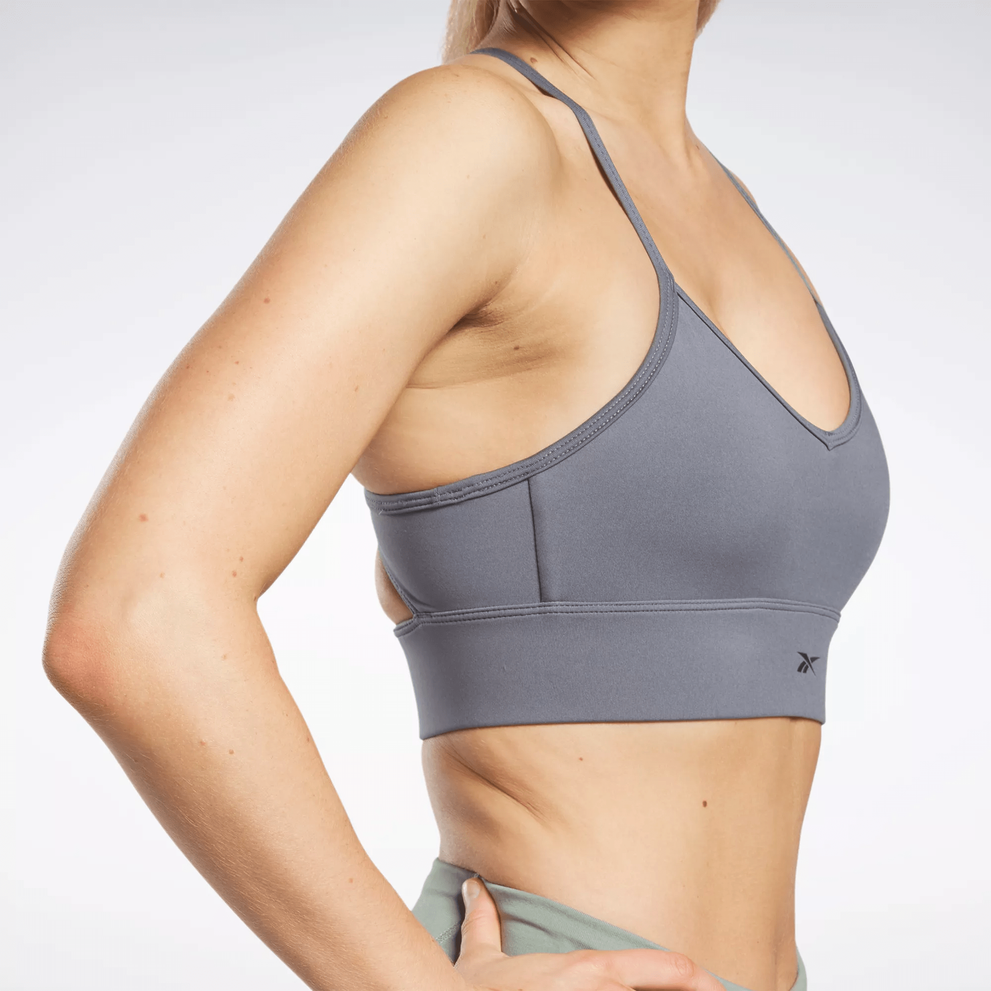 Wear this Reebok tri-back sports bra and put a little style in your training session. The soft. V-neckline creates a flattering look. The straps form a triangle pattern out back and a keyhole cutout below add breathability. Speedwick tech keeps you comfortable and dry as you lift.